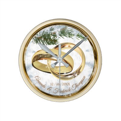 Freshly fallen snow in a winter wonderland with two golden rings wall clock as a wedding momentum myWeddings